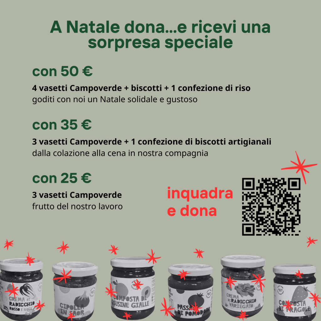 - Con 50€ 🎄 goditi con noi un Natale solidale e gustoso: 4 vasetti Campoverde + 1 confezione di biscotti artigianali + 1 confezione di riso